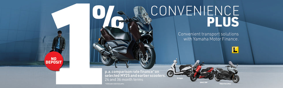 *Finance available to approved personal applicants or commercial applicants with a registered valid ABN (excludes fleet, government and rental buyers). A 1% p.a. Comparison rate is available on new MY25 or earlier D’elight, XMAX 300 and TMAX 560 models on a term of 24 or 36 months, with no application or monthly account keeping fees. Dealer Application fee of up to $250 for D’elight and up to $500 for XMAX 300 and up to $750 for TMAX 560 applies. Credit criteria, fees, charges, terms and conditions apply. Comparison rate is based on a 3-year secured fixed rate consumer loan of $10,000. WARNING: The comparison rate is true only for the example given and may not include all fees and charges. Different terms, fees or other loan amounts might result in a different comparison rate. Offer available from participating Yamaha dealers from 01/10/2025 until 31/12/2025 and settled no later than 31/01/2026. Excludes any other offers. While stocks last. Finance is provided by Yamaha Motor Finance Australia Pty Ltd. ABN 29 101 928 670 Australian Credit Licence No 394553.